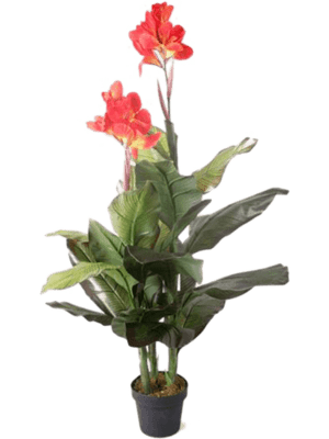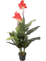 Канна H120 см с оранжевыми цветами в пластиковом сером кашпо.