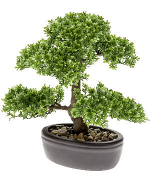 Бонсай Фикус H32 см зеленого цвета в кашпо овальной формы коричневого цвета.