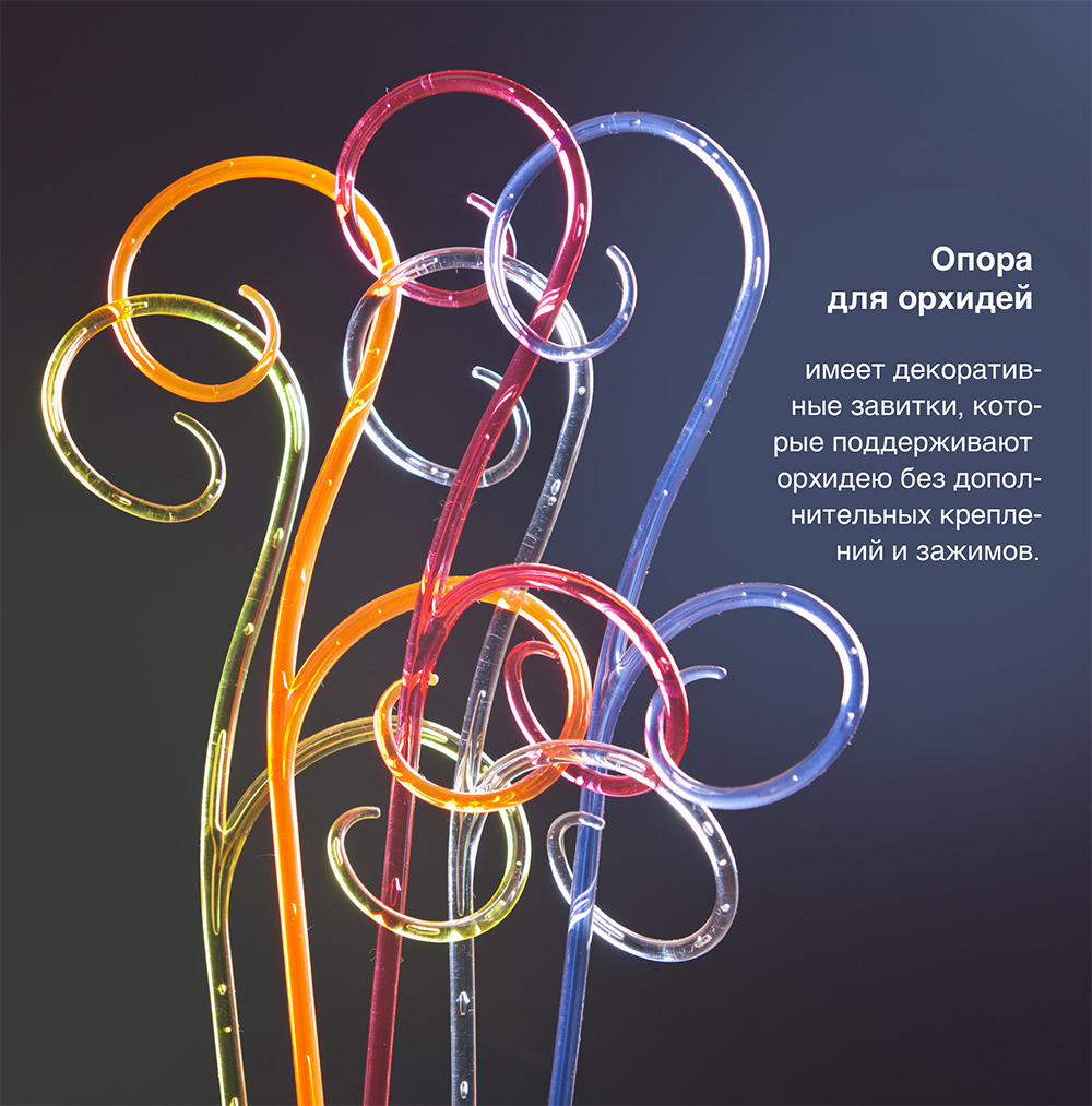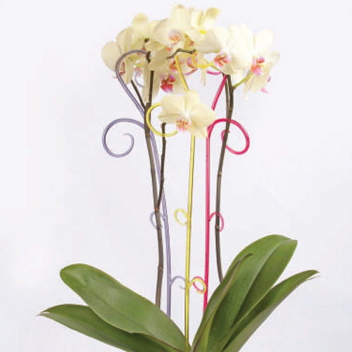 Опора для орхидей имеет декоративные завитки, которые поддерживают орхидею без дополнительных креплений и зажимов.