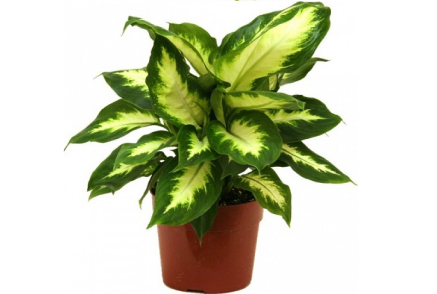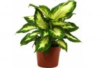 Диффенбахия (Dieffenbachia) - вечнозеленое многолетние растение с крупными листьями, красивой формы, с пёстрым рисунком расположенными на стеблях поочередно. Стебель толстый, крепкий. Рисунок на листьях представляет собой полоски, пятнышки, крапинки разных оттенков от светло-зеленых до тёмно-жёлтых. Яркая окраска растения создаёт тёплую, радостную атмосферу в помещении.