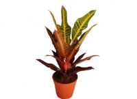 Кротон (Codiaeum) - у этого растения необыкновенно красивые листья разнообразной формы. Можно заметить, что на одном растении есть листья овальные, закрученные, ланцетные. Окраска от оранжевой до красной, от желтой до зеленой, с добавлением разноцветных полосочек, пятнышек, штрихов - просто радуга, переливающаяся всеми цветами.