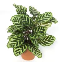 Уход: Калатеи - сравнительно теневыносливые растения, хорошо развиваются при рассеянном свете, любят яркий рассеянный свет. В зимнее время растениям также желательно хорошее освещение. Плохо переносят прямые солнечные лучи в период весенних и летних месяцев. Размер и окраска листьев зависят от того, удачно ли защищено растение от солнца. Если свет очень яркий, листья теряют свою окраску, а также уменьшается листовая пластинка. Хорошо растут вблизи окон восточного и западного направления, возле окон южного направления обязательно притенение от прямого солнца. Могут расти калатеи при искусственном освещении люминесцентными лампами в течение 16 часов в день. В весенне-летний период в течение дня подходящая для калатей температура находится в районе 22-30°С, ночью чуть прохладнее. Зимой - даже ночью - не ниже 18°С и не выше 25°С. Растения очень чувствительны к перепадам температуры и сквознякам. Очень важно выдерживать температуру почвы 18-20°С, летом около 22°С. Переохлаждение корней губительно для растения. Полив требуется обильный, по мере подсыхания верхнего слоя субстрата. Осенью и зимой полив несколько уменьшают. Поливают теплой мягкой хорошо отстоянной водой. Важно следить за тем, чтобы не пересушить, не заболотить почву и не допустить охлаждения корневой системы. Особенно чувствительна к переувлажнению субстрата калатея Макоя. Калатея предпочитает повышенную влажность воздуха (от 70 до 90%). Для нее необходимо в течение всего года регулярное опрыскивание. Опрыскивают хорошо отстоянной или отфильтрованной водой, мелким распылением, так как крупные капли воды не должны попадать на листья - на них могут появиться темные пятна.
