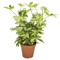 Уход. Растение устраивает комнатная температура -от 18 до 22 °С, зимой чуть ниже - от 16 до 18 °С. Сквозняков шеффлера не любит, но на свежем воздухе летом чувствует себя хорошо. Зимой растение поливают не более 2 раз в месяц. Весной и летом полив увеличивают до умеренного, но не переливают растение, поскольку очень влажная почва в горшке приводит к сбрасыванию листьев. Не следует и пересушивать почву. Если шеффлера находится на улице, под солнцем, поливать нужно чаще, почва должна быть умеренно влажной. А вот влажность воздуха растению требуется повышенная. Значит, следует регулярно опрыскивать его водой из пульверизатора. Пересаживают растение по желанию 1 раз в год или 1 раз в 2 года.