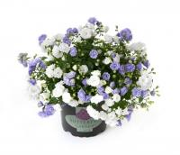 Кампанула (Campanula) - это ампельное травянистое растение высотой 20-30 см с тонкими стелющимися или свисающими вниз побегами. Листья очередные, округло-сердцевидные с зубчатыми краями, на длинных хрупких черешках, от 3 до 5 см в диаметре. Многочисленные цветы-колокольчики (ярко-белые у "невесты" и нежно-голубые – у "жениха") до 4 см в диаметре обильно покрывают все растение с июня по октябрь.