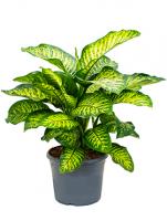 Диффенбахия (Dieffenbachia) - вечнозеленое многолетние растение с крупными листьями, красивой формы, с пёстрым рисунком расположенными на стеблях поочередно. Стебель толстый, крепкий. Рисунок на листьях представляет собой полоски, пятнышки, крапинки разных оттенков от светло-зеленых до тёмно-жёлтых. Яркая окраска растения создаёт тёплую, радостную атмосферу в помещении.