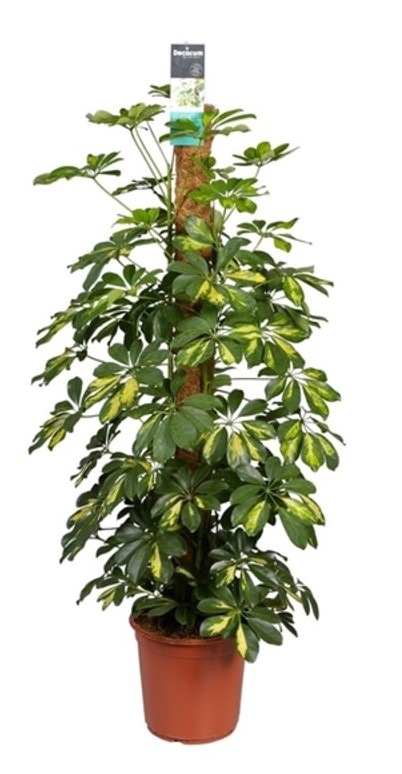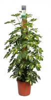 Уход. Растение устраивает комнатная температура -от 18 до 22 °С, зимой чуть ниже - от 16 до 18 °С. Сквозняков шеффлера не любит, но на свежем воздухе летом чувствует себя хорошо. Зимой растение поливают не более 2 раз в месяц. Весной и летом полив увеличивают до умеренного, но не переливают растение, поскольку очень влажная почва в горшке приводит к сбрасыванию листьев. Не следует и пересушивать почву. Если шеффлера находится на улице, под солнцем, поливать нужно чаще, почва должна быть умеренно влажной. А вот влажность воздуха растению требуется повышенная. Значит, следует регулярно опрыскивать его водой из пульверизатора. Пересаживают растение по желанию 1 раз в год или 1 раз в 2 года.