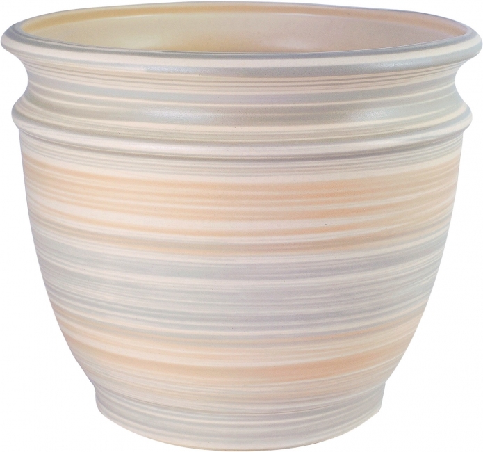 Выполнен в глазури слоновая кость с нанесенными, по всей поверхности горшка, концентрическими полосами серо-голубого и светло-коричневого цветов.
